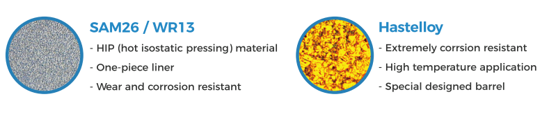 We offer wide range of MoC for barrels, screw elements and shafts. With out exclusively developed extremely wear and corrosion resistant material, the service life of barrels could be extended several times compared to HIP material for compounding polymers with glass and carbon fibers, ceramic and metal masses, and inorganic fillers.